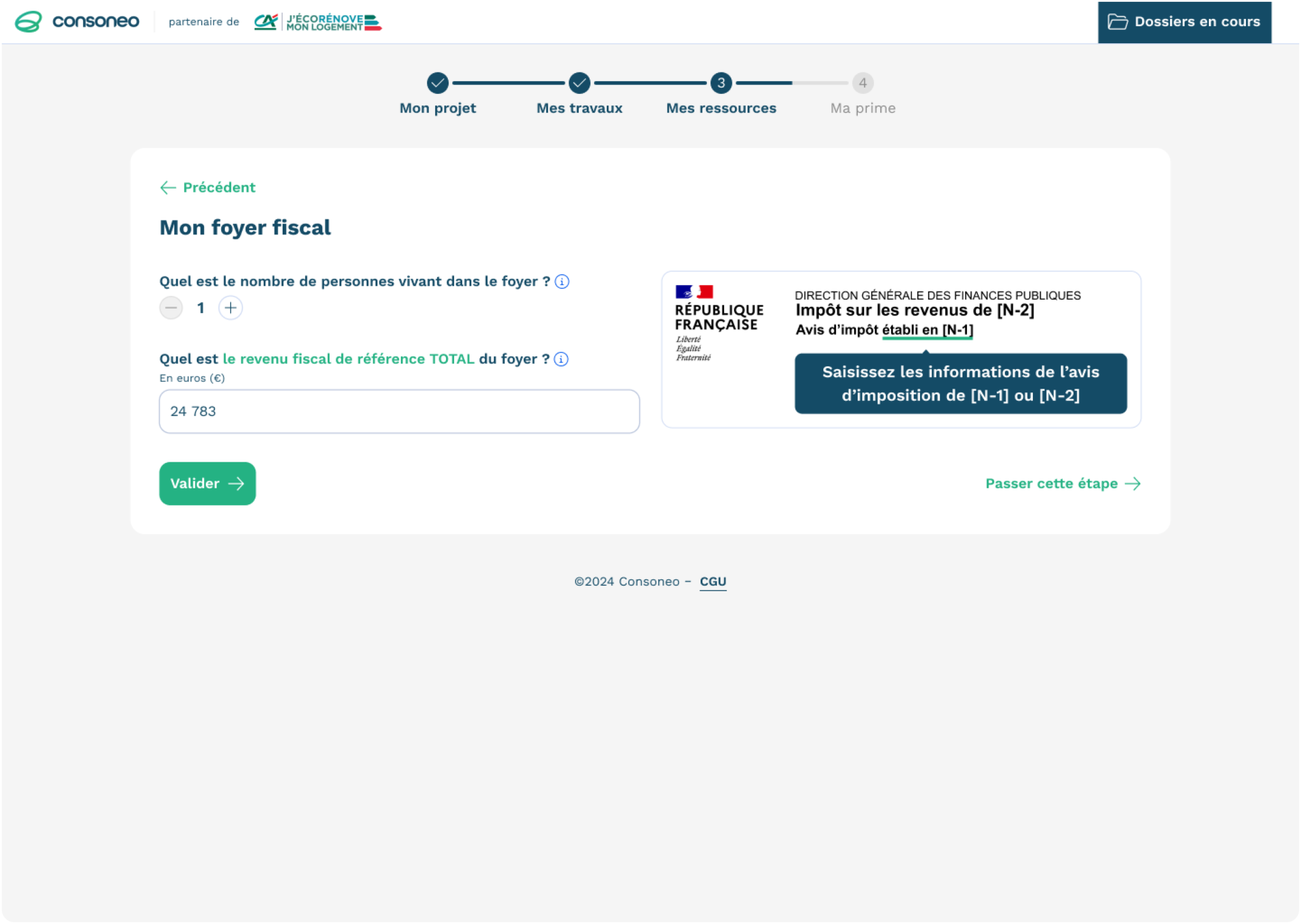 – Choix du logement – Note énergétique (étape facultative) – Informations logement – Travaux choisis – Éligibilité (étape facultative) – Résultats de prime (choix des travaux modifiables et éligibilité) – Identification du client – Adresse des travaux – Confirmation de la demande de prime – Confirmation de l’éligibilité (si déclarée) – Ajout du justificatif de performance énergétique