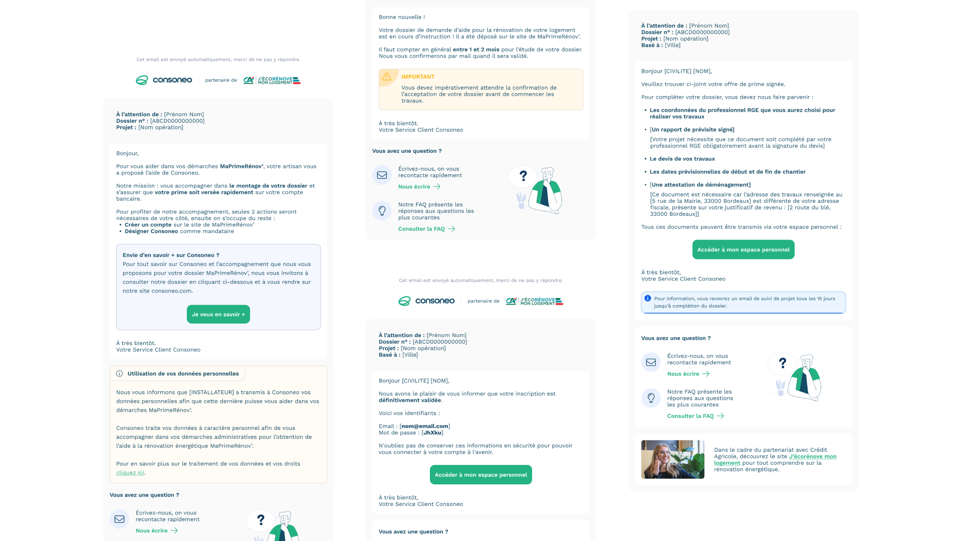 Nous avons mis au point un template d’email personnalisé pour le partenariat Crédit Agricole x Consoneo. L’attention a été notamment portée sur le ton, les formulations de phrase et les éléments de réassurances.